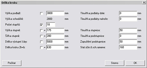 2. SPIRIT vygeneruje základní tvar schodiště. Vyberte volbu ParamSch a dále Výpočet. Zadejte parametry schodiště podle obrázku, aktivujte volbu Počet stupňů a klikněte na tlačítko Počítat. Proběhne nový výpočet schodiště (výška stupňů...). Ukončete dialogové okno tlačítkem OK.